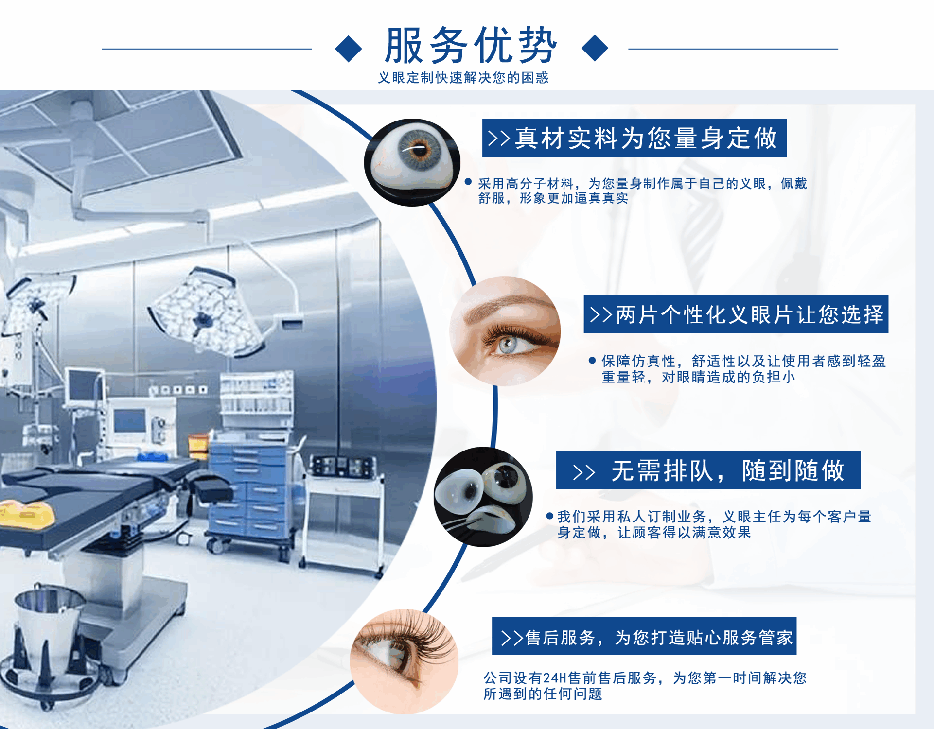 正目醫療科技有限公司致力于為用戶提供假眼,在哪里可以定制義眼,義眼哪家好,假眼價格,義眼價格,義眼費用,義眼公司,是集義眼定制、保養、咨詢為一體的綜合性義眼定制企業。 獨創的義眼工藝結構,根據仿生物學原理,采用進口醫用植入材料:高分子材料、無毒素、性能穩定、堅固耐用)、聚甲基丙乙烯阝-羥乙酯HEMA材料(軟性親水性材料),結合獨特的義眼個性化佩戴技術,按佩戴者健眼的形態、角膜、虹膜、及瞳孔的大小、色澤、血管紋理和脂肪分布,設計制作。擁有超薄、質輕、光滑、親水透氧、佩戴舒適和高逼真的特點。為保證佩戴效...